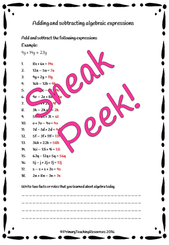 There are a range of different algebra worksheets, including generating expressions, solving simple equations and calculating values.